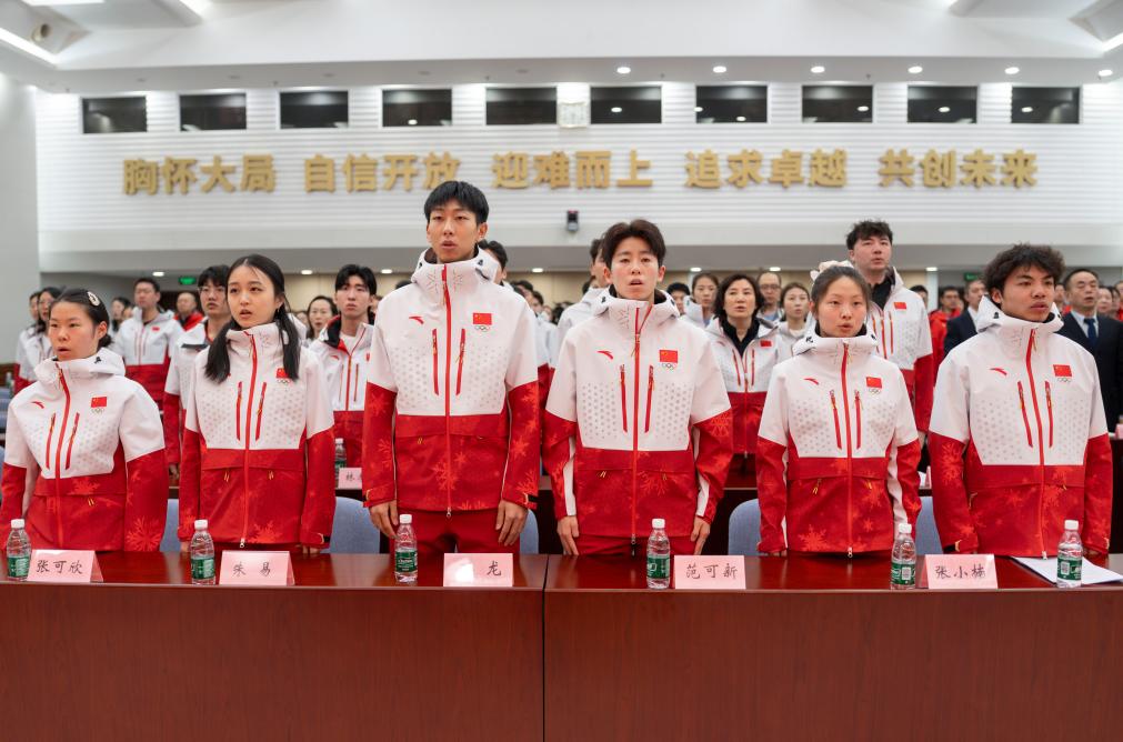 1月24日,中國體育代表團成員在成立動員大會上唱國歌。