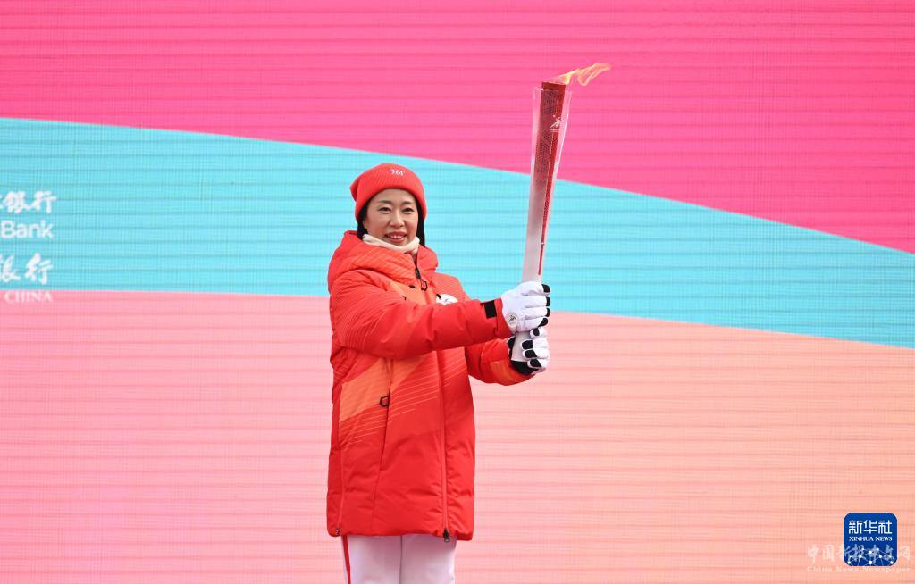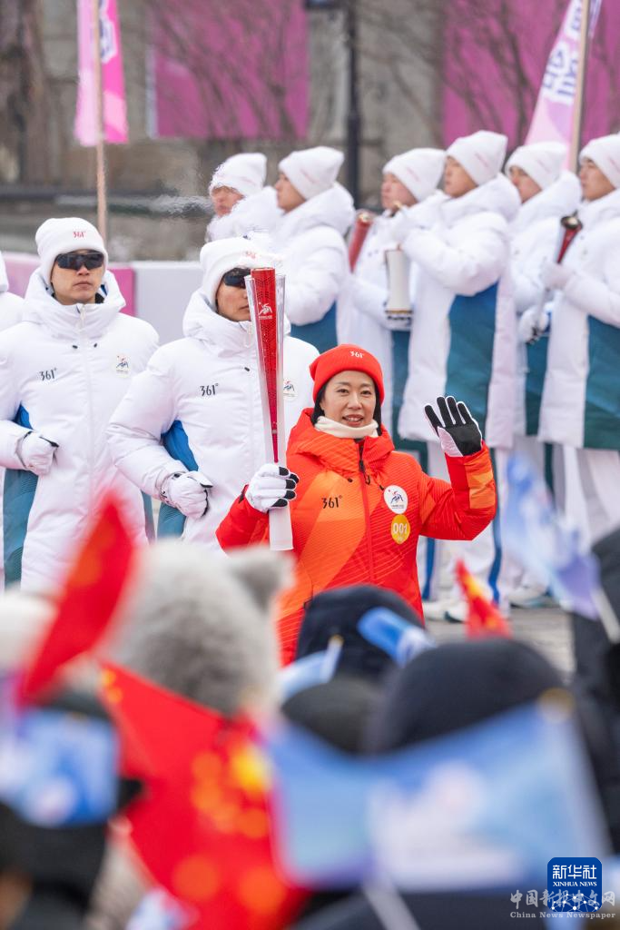 2月3日,第一棒火炬手、奧運(yùn)冠軍申雪在傳遞火炬。