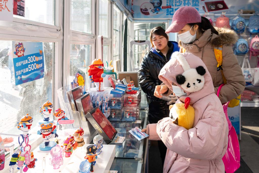 1月8日,游客在哈爾濱一家亞冬會(huì)特許商品零售店里挑選文創(chuàng)產(chǎn)品。新華社記者 謝劍飛 攝