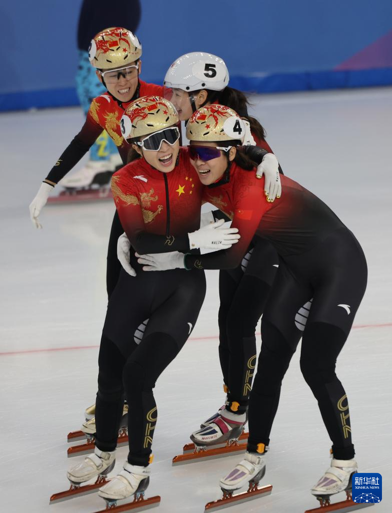 2月9日,中國隊(duì)選手張楚桐、公俐、王欣然、范可新(從右到左)慶祝奪冠。