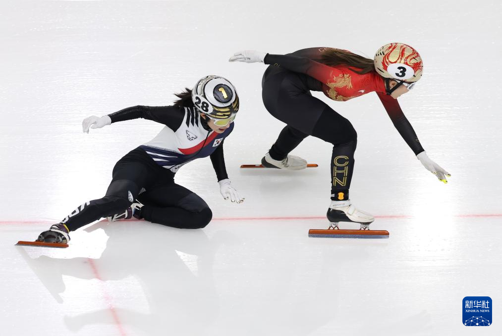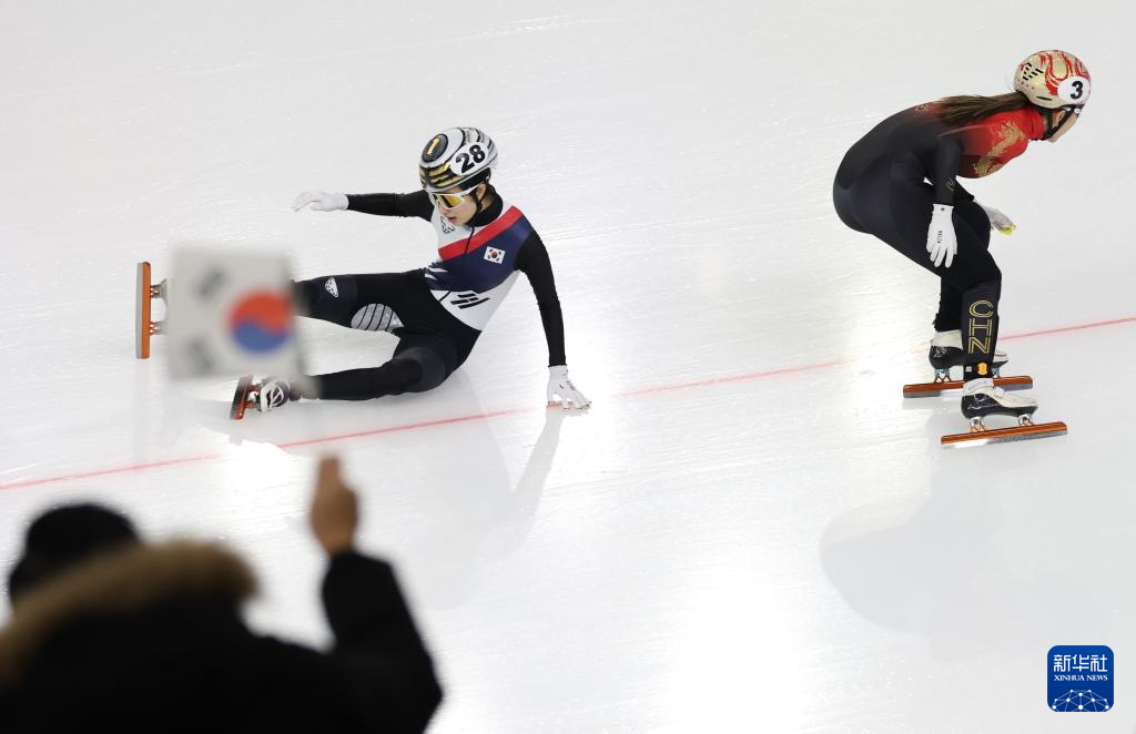 2月9日,中國隊(duì)選手公俐(左)在比賽中沖刺,韓國隊(duì)選手金吉莉在比賽中摔倒。