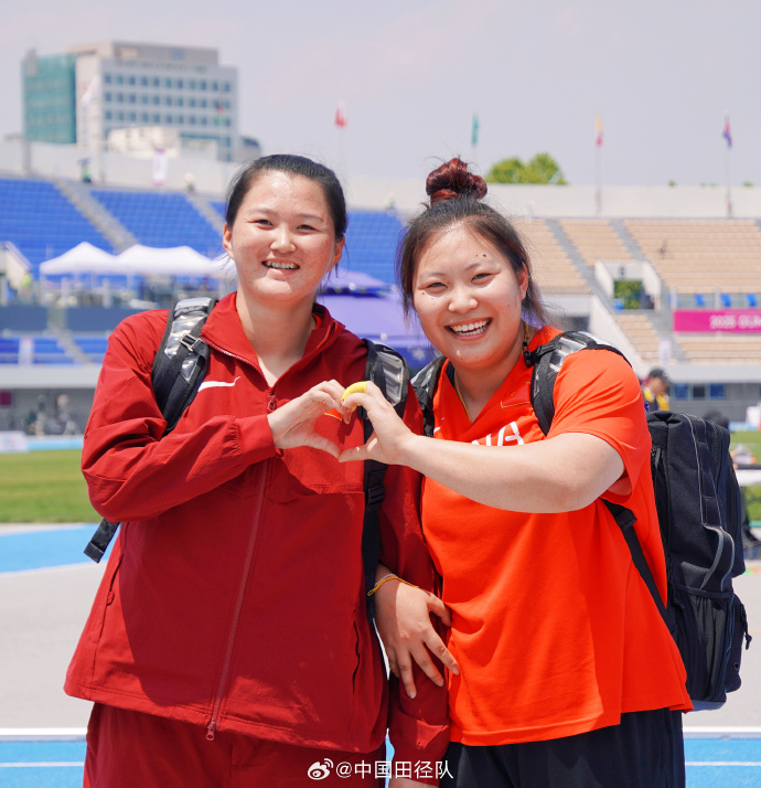 中國隊選手吉莉(右)和李江燕(左)分獲女子鏈球項目金、銀牌。圖源:中國田徑隊微博