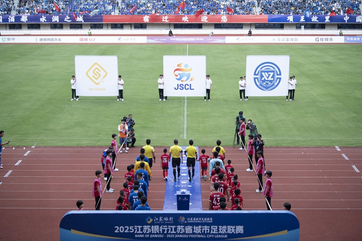 5月25日,參賽球員在比賽前入場。當(dāng)日,2025年江蘇省城市足球聯(lián)賽第2輪比賽在宿遷市奧體中心體育場舉行。新華網(wǎng)發(fā)(馬海峰 攝)