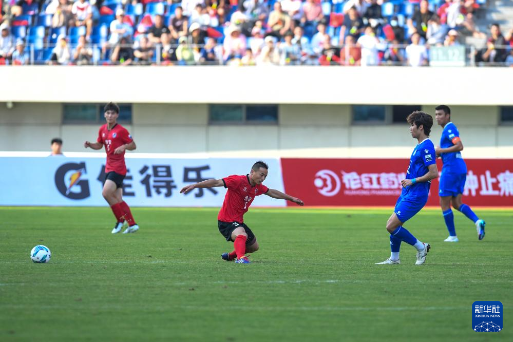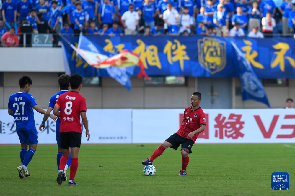 6月14日,淮安隊球員戴虎(左二)在2025江蘇省城市足球聯(lián)賽第四輪對陣南京隊的比賽中。最終,淮安隊主場與南京隊1比1戰(zhàn)平。