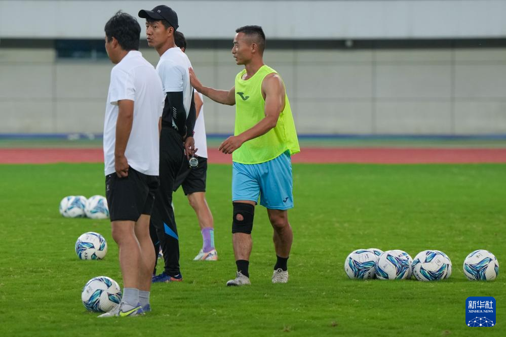 6月23日,戴虎(右)在訓(xùn)練中與淮安隊主教練董松(左二)交流。