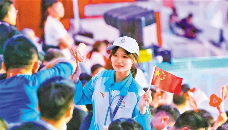 11月9日,志愿者在十五運會開幕式看臺與觀眾互動。本次開幕式場館及周邊賽會志愿者共有2350人,來自廣州地區(qū)16所高校28個校區(qū)。