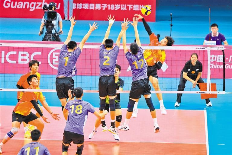 11月10日,運動員在十五運會U18男排小組賽中比拼。