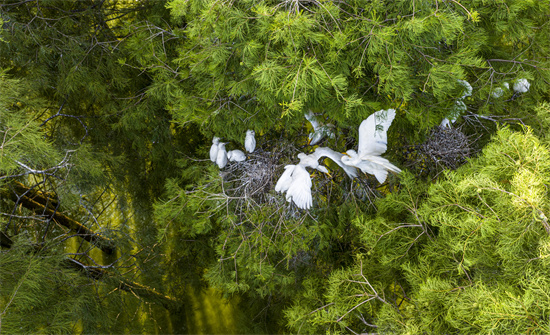 2025年6月17日,在安徽省合肥市廬江縣柯坦鎮(zhèn)城池村大漢塘池杉林中,成千上萬只牛背鷺、白鷺、蒼鷺等多種夏季候鳥在此棲息,聰明的它們藏身樹蔭避暑,筑巢、孵育度盛夏。