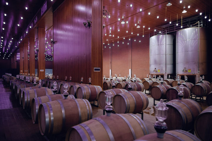 閩寧鎮(zhèn)賀蘭神酒莊釀酒車間的橡木桶。(永寧縣委宣傳部供圖)
