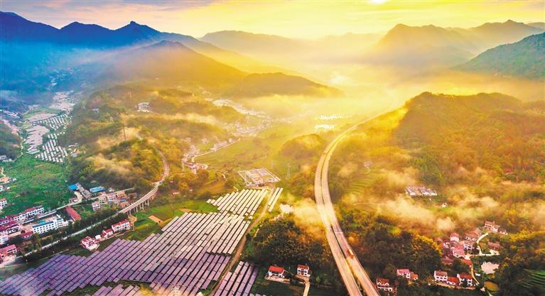 9月14日,湖北省黃岡市英山縣楊柳灣鎮(zhèn)新鋪街村,道路、群山、村莊、光伏發(fā)電板相映成景。 王 江攝(中經(jīng)視覺)