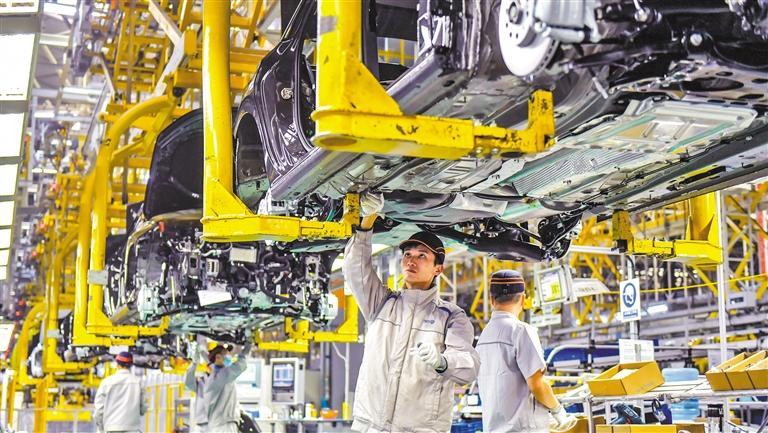 12月9日,位于四川省成都經(jīng)濟(jì)技術(shù)開發(fā)區(qū)的一汽—大眾成都分公司,員工在組裝車輛。該公司最快54秒即可產(chǎn)出下線一輛新車,最高日產(chǎn)量2000臺(tái)。李向雨攝(中經(jīng)視覺)