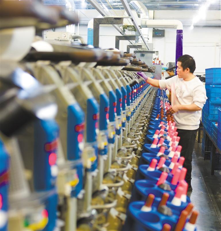 11月10日,安徽省馬鞍山市當(dāng)涂經(jīng)濟(jì)開發(fā)區(qū)植護(hù)家化有限公司,自動(dòng)化生產(chǎn)線快速打包下線產(chǎn)品,準(zhǔn)備發(fā)往全國各地。王文生攝(中經(jīng)視覺)