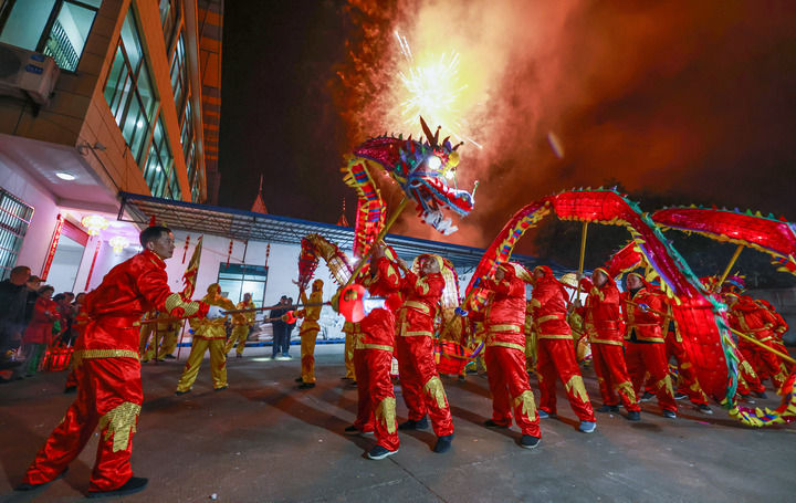 2024年2月10日,浙江省諸暨市安華鎮(zhèn)礦亭村村民進(jìn)行舞龍表演,慶祝春節(jié)。新華社記者 徐昱 攝