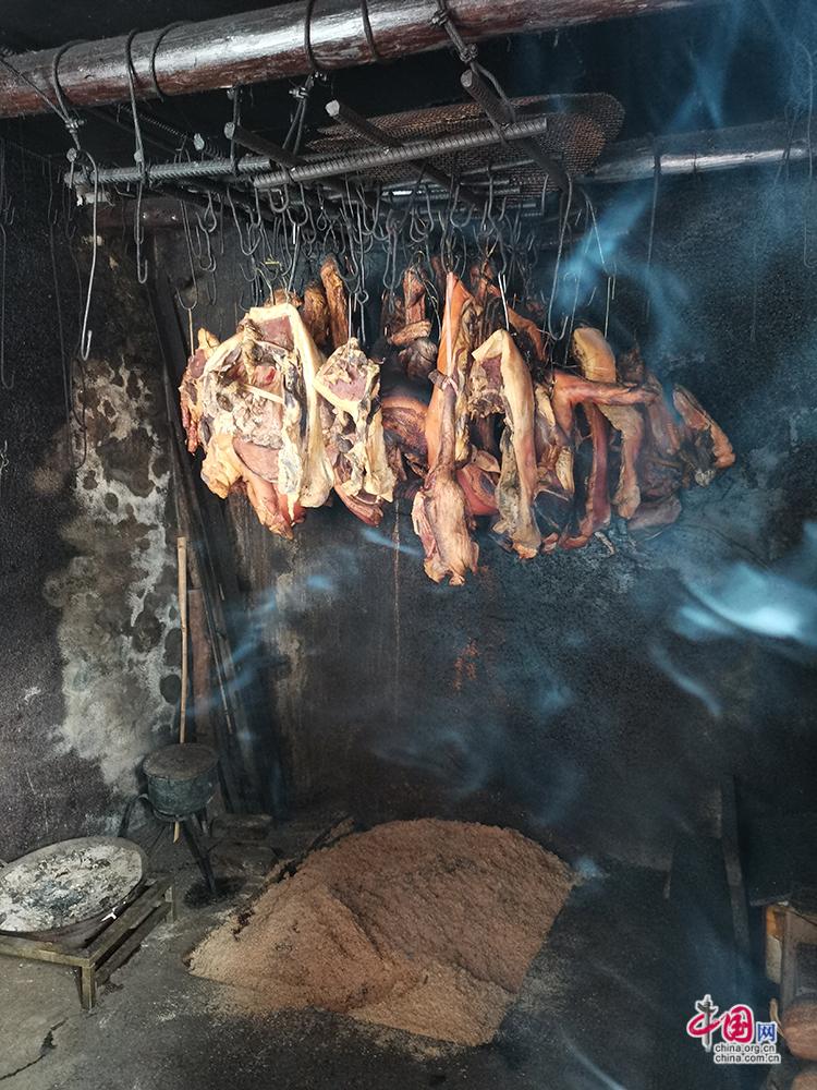 殺完年豬后,當(dāng)?shù)厝藭?huì)把上好的五花肉懸掛在火塘里熏制。四川和湖南等地區(qū)因地處山區(qū),環(huán)境氣候特別適合臘肉的腌制,還因農(nóng)家年豬都是用當(dāng)?shù)爻霎a(chǎn)的紅薯等糧食作物喂養(yǎng)而成,肉質(zhì)絕對(duì)上乘,腌制出來(lái)的臘肉具有色鮮、香醇、味美等特點(diǎn)。尹忠攝影
