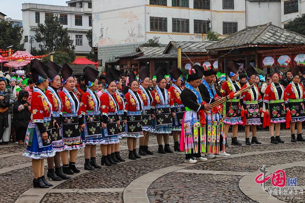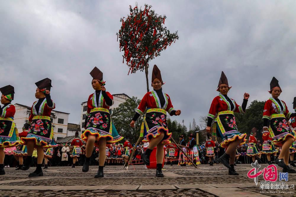 2月3日,苗族同胞在貴州省安順市西秀區(qū)舊州鎮(zhèn)碧波廣場跳花節(jié)上表演舞蹈。
