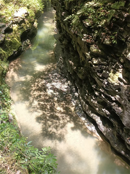 踏入峽谷,仿佛進(jìn)入了一個(gè)全新的世界。這里綠樹蓊郁,蓊蓊郁郁的枝葉交織在一起,形成了一片綠色的天幕。陽(yáng)光透過層層疊疊的枝葉,灑下斑駁陸離的光影,宛如點(diǎn)點(diǎn)碎金,鋪就了一條通往自然深處的夢(mèng)幻之路??諝庵须硽柚逍碌牟菽鞠銡猓鞘且环N混合著泥土芬芳與樹葉青澀的味道,深深吸上一口,頓感心曠神怡,仿佛所有的疲憊都在這一刻被一掃而空。