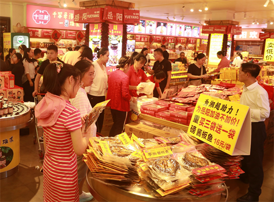 同時,岳陽城區(qū)商超零售人氣攀升,消費(fèi)購物熱情高漲。在岳陽樓景區(qū)汴河街中華老字號“十三村”特產(chǎn)店,人頭攢動,張燈結(jié)彩,以“湘超”為主題精心布展,“為湘超助力、為岳陽加油不加價”宣傳牌比比皆是,貨架上擺滿了琳瑯滿目的中華老字號產(chǎn)品,包括香菇醬、手撕醬板魚、醬板鴨等 。