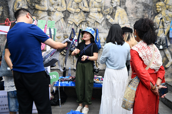 10月2日,一重慶游客(中)在貴州省凱里市繡里淘非遺集中市客串生活碎片包攤主。(楊仁海 攝)