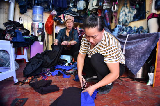 10月2日,一攤主(前)在貴州省凱里市繡里淘非遺集中市改制苗繡短裙。(楊仁海 攝)