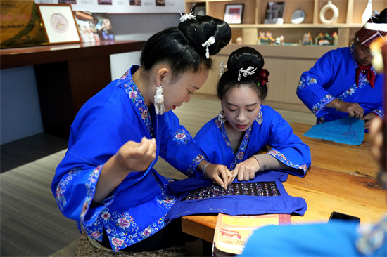 在臺(tái)江縣長(zhǎng)灘村“媽媽制造”苗繡合作社里繡娘們正在一起刺繡(龍軍 攝)