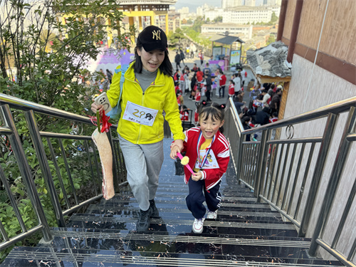 記者現(xiàn)場看到,比賽中,一名交警鐵騎開道,中、小班與大班親子運(yùn)動員們一起出發(fā),分別直跑一段距離、繞過銀帽廣場展廳背后,于該景區(qū)公路匯合,蜿蜒而上,途中設(shè)有五個(gè)打卡點(diǎn)。一路上你追我趕,吶喊加油,或并行跑步,或手牽手快走,或家長背著,頑強(qiáng)拼搏跑向終點(diǎn)。